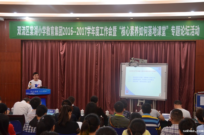 2016年9月30日,告别九月,风吟唱着秋日的恋歌,轻轻划过树梢。这一天,在棠湖小学合唱排练厅里,最后一朵秋日的海棠花,带着阳光的嘱托,绽放在了棠湖小学教育集团关于“核心素养如何落地课堂”的专题活动现场。本次与会人员有各小课题研学会学员、各集团校教导处主任以及分管教学副校长。一群特别的来宾也莅临了本次专题活动,他们是教育局小教科科长罗丽、研培中心主任邱刚田、副主任谢祖福、九江小学乔秀平校长、黄甲小学穆占文校长、公兴小学李刚校长、棠湖小学(南区)王云章校长、青白江玉虹小学王志东校长。此次的相聚,承前继后。即是对集团启动以来三年发展计划成果的阶段梳理,同时也以“核心素养落地”为抓手,对未来三年集团这个研学共同体更为实效、实在的运做指明了行进的方向。会议在棠湖小学李顺榕校长的致词中拉开了华丽的序幕。